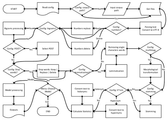 The texts were pre-processed through quite a number of steps, the major ones of which are presented in the flowchart (Figure 4) and summarized in Table 2 (the options that gave better results are in bold). Some details or steps cannot be presented in the flowchart because that would make it too large and unclear. The steps are defined by the initial parameters written in the plain text configuration file. Actual parameters can be changed from initial ones via the menu.