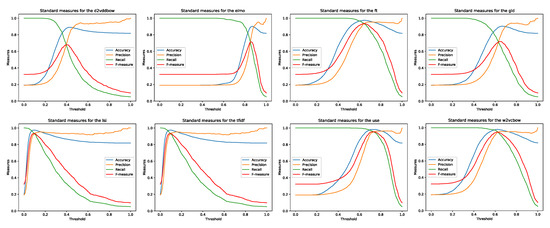We used the standard measures of accuracy, precision, recall, and F-measure (F1) to evaluate the results of the experiments. If we mark TP as true positive, TN as true negative, FP as false positive, FN as false negative, and N as number of all documents/texts/sentences, then: