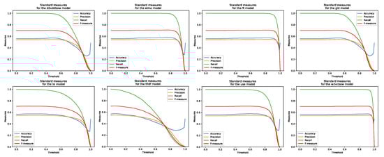 Precision/recall curves for eight models processing Webis corpus.