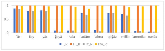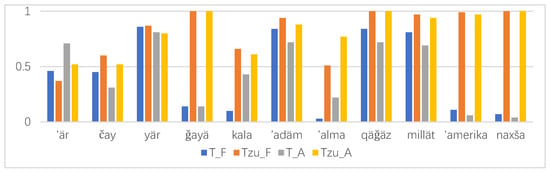 Table 8 presents a comparison of the retrieval effect of T with the current BM algorithm and the retrieval of Tz with the BM-U algorithm proposed in this paper. For weakened words, all parameters were significantly increased; meanwhile, for non-weakened words, P, F, and A-value increased, R-value decreased and in the BM algorithm always T_R = 1. The R-value of BM-U on Tz is obviously improved once the algorithm is improved, but Tz_R <1 for some words. Here, the decline in R is mainly because the partially misspelled word T can still meet the matching conditions, and Tz cannot meet the syllable-based matching conditions, resulting in Tz_R <1 for BM-U. Taking No. 3 in Table 5 as an example, Tz_R = 0.75 (TP = 98, FN = 32) of the BM algorithm when P = yil, Tz_R = 0.96 (TP = 125, FN = 5) for the BM-U algorithm, and improving the algorithm increases the R-value by 21%. However, there are still five words that change the syllable structure due to misspelling {(FN = 5): (bir+yildn, yild+din, yill+din, yill+rdin, yi+le+si+ri)} has not been retrieved. The correct spelling of these five words should be { bir+yil+din, yil+din, yil+din, yil+lir+din, yi+li+siri }. The retrieval efficiency of the weakened words is relatively obvious in the algorithm. Figure 1 shows a comparison of the R-values of the weakened words by the two algorithms, and Figure 2 shows a comparison of the F and A-values of the weakened words by the two algorithms.