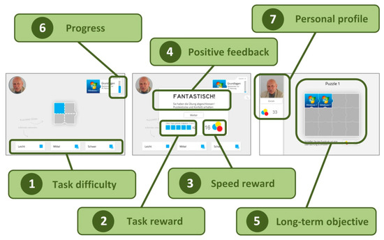 PC-Trainer was implemented in two variants, one version included seven gamification elements, and one version did not. The gamification itself was designed to be rather “mild” as well as “meaningful” for the participants, in order to not induce feelings of ridiculousness or too much (time) pressure, which could be counterproductive [49]. The overall goal of the gamified application was to complete a puzzle. Puzzle pieces could be earned by accomplishing as many tasks as possible without help. The specific elements used in the gamified version are shown in Figure 2. They included: