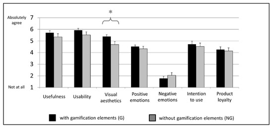 Mean user experience ratings (meCUE questionnaire) for the gamified and the non-gamified version. Error bars indicate the standard error of the mean. Significance level: * p < 0.05 resulting from the two-by-two multivariate analyses of variance (MANOVA).