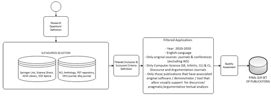 Figure 1 details the SLR process performed. First, we identified the main research repositories for finding relevant work that answer our research questions. Then, we eliminated duplications, defining a filtered inclusion/exclusion strategy. Finally, we analyzed the title and abstract of the resultant publications. In this step, we also applied some quality assessment criteria as a checklist to the works obtained. This quality assessment step ensured that the works reviewed have no important bias and fit the scope and relevance criteria. The resultant set of publications constitutes the relevant work done on visualization software assistance (labeled as group 2 in the Introduction) for supporting or assisting discourse and argumentation textual analysis tasks.