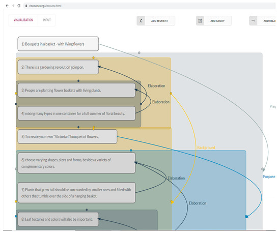 Secondly, it is possible to hide the literal text of the analysis performed, showing the option “Simplified mode”. At that time, all segments and groups acquire the same size and alignment, hiding the literal text to analyze and keeping only the name of the segment or group. This simplified view allows the user to abstract from the literal text, focusing on the discursive or argumentation relationships detected and facilitating the comparison between several analyses on the same text or the calculation of simple metrics (number of discursive relationships of a specific type, etc.). In the future, we plan to offer this automatic metrics calculation and comparative functionality implemented as a module in Viscourse. Figure 2 and Figure 3 show the same textual analysis (“Bouquets in the basket” text form RST corpus) with different levels of granularity.