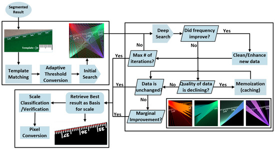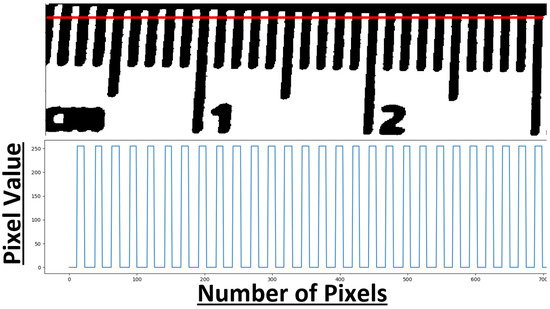A patch or window of size from the image denoted is compared against a template denoted , creating an array set of results that represent the matches [36]. The best match is selected with which chooses the best matrix denoted as the comparison with the points and their position having the global maximum. The template ruler was manually created and designed with the dimensions of a metric ruler; however, our system can identify an imperial ruler with the same template. The size of the TemplateWindow is bounded between to px and its value is calculated based on the size of the RulerImage, this is to reduce computing time. The size of the TemplateWindow is initially calculated as the length of the shortest dimension of the segmented result. It is then incrementally reduced to fit in the aforementioned bounds. The size reflects the pixel density of the image where 500 px corresponds to images larger than px. The lower bound is the minimum resolution the system can search with and is used for images as small as px. To finish preparations for the deep search the image is converted to black and white using adaptive thresholding. We chose this method over others, such as Otsu Method (https://www.mdpi.com/search?q=otsu), because it does not look at the global values of the image. Adaptive thresholding converts a gray scale image to black and white by splitting the image into windows and taking the local minimum/maximum of the window. The method for adaptive thresholding in OpenCV (Open Computer Vision) [36] takes a thresholding method as a parameter such as Otsu but for our system Binary thresholding was used. In our system we used ADAPTIVE_THRESH_GAUSSIAN_C as the thresholding method because it takes the weighted sum of the neighborhood instead of the mean [36]. The mean value produces results closer to the Otsu method which only considers the mean value of the image. For the purpose of removing localized noise we used the Gaussian_C method to ensure better results. The window size must also be specified by a kernel, space similar to convolution. Adaptive thresholding has other uses such as edge/object detection [29] and feature extraction/segmentation [37,38,39].