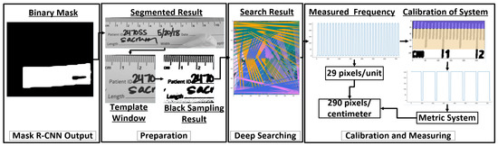 To generate the calibrated output, our method follows three steps: Preparation, Deep Searching, and Calibration/Conversion. Each of these steps or components and their contribution to the system can be seen in Figure 2. In addition, in this figure, preparation, the output of Mask R-CNN can be seen as either a segmented ruler or a bounding box. The preparation step includes cropping, down-sampling, removal of noise, and testing the image for spatial frequencies before the deep search. In the deep search, the method will search the ruler by looking for spatial frequencies corresponding to the graduations or ticks on a ruler.