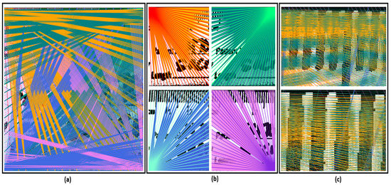(Deep Search Rendering) (a) All searches collectively. Note the crisscrossing at the top of the image where the density shows the search optimization. (b) Each search separated by the corner where the search started. In the top left, the red lines correspond to the initial search. (c) A zoomed in piece of each search where a set of ticks are located (best seen in color).