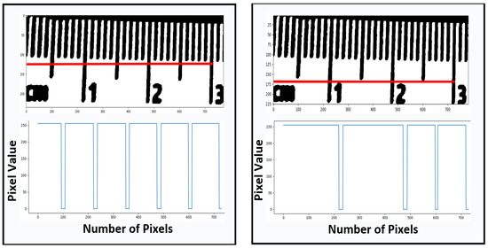 After each search the list of results is filtered to determine if the average number of graduations or spatial frequencies has improved. The first filter will remove results that were less than the average uniform spatial frequency, from Equation (1), in the most recent search. The second filter removes results with a large slope with respect to both the vertical and horizontal axis. The two filters will drop on average half of the search results. The deep search is looking for the improved spatial frequency over each iteration of results. The conclusion of the search will occur when either of the following is true: (1) the search has gone on for too long or (2) the average uniform spatial frequency has not changed. The limited number of searches is meant to provide an extensive yet deterministic result as there could be marginal improvement over many searches. From experimentation, the first condition typically means there was no good result to pick. Meaning the image was not very clear. An unchanged average uniform spatial frequency or the same number of measured graduations is the desired outcome of the deep search where there will either be only one spatial frequency, or a set of spatial frequencies equivalent to the average. In the worst case, the average spatial frequency could decrease after a search. In this scenario, we resort to memoization (https://en.wikipedia.org/wiki/Memoization) and expect the best result to exist in the previous search. When the search exhausts all the available options we retrieve a single spatial frequency. The red line in Figure 4 is the final resulting line and its corresponding spatial frequency is below. In the final calculation we consider both the black and white values for width in the length of a single graduation. We measure the value for a single graduation as where is the sum of the modes for the black spatial frequency and white spatial frequency .