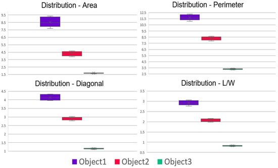 Distribution of measurements performed using proposed heuristic calibration method. Object 1 is the largest object from Figure 7, Object 2 is the second largest object, and Object 3 is the smallest object.
