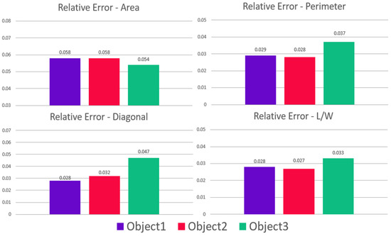 We performed real measurements for the Area, L/W, Diagonal, and Perimeter, both in metrics and in pixels. We expected the error to be squared in the area measurements and have included it in our results for completeness. We found that on average the measurement for calibrating the test image was 9 pixels/millimeter. Our calibrated results include the images taken at different heights are included in Figure 8 and Figure 9. From the 24 of the 30 measurements for length and width our proposed calibration method measured within 1 mm of error with the remaining 6 having less than 2 mm of error. The average of the 10 measurements obtained for objects 1, 2, and 3 are 2.92 cm, 2.08 cm, and 0.82 cm, respectively. Figure 9 shows the relative error for L/W, Diagonal, and Perimeter measurements was less than with the relative error for Area less than . We found that the system performed slightly better on Object 1 and 2 than it did for Object 3. As Object 3 is the smallest, with a length of 8 mm, this can be attributed to our measurements being done at the pixel level.