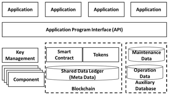 Blockchain ledgers and smart contracts allow metadata to be operated within blockchain components. On the other hand, the computational power, data storage space and read access control amount of the blockchain can be limited (see Figure 2). Therefore, operation and maintenance data, and application logic should be implemented outside the blockchain component. There is an API layer between the data storage mechanisms. Key management is essential for blockchain operations. Every participant in the blockchain network has a private key, which is used to digitally sign for transactions.