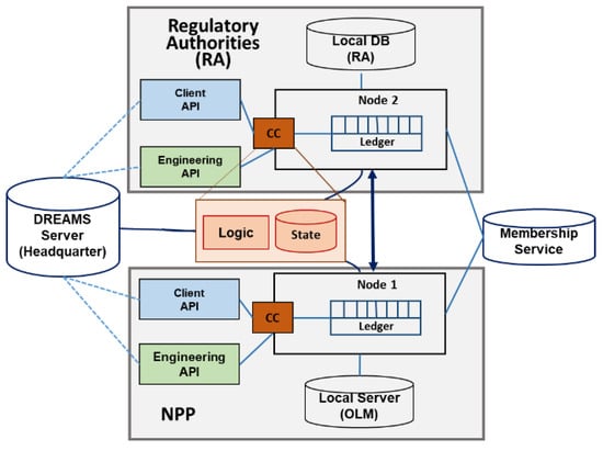 In a public blockchain system such as bitcoin, anyone can be a processing node (or a “miner”). In private blockchain systems, acceptance of processing nodes is controlled by the management body []. Private blockchain can provide solutions to financial and business problems, such as compliance with the health insurance portability and accountability act (HIPAA), anti-money laundering (AMLs), and know your customer (KYC) lows []. Plant management systems for nuclear power plants should select the private blockchain system. Most public blockchains use the Nakamoto consensus. The conventional processing node here treats the longest history in the block as the canonical history. However, in private blockchains with a smaller number and reliable nodes, traditional replication algorithms such as practical byzantine fault tolerance (PBFT) can be used in place of Nakamoto consensus [].