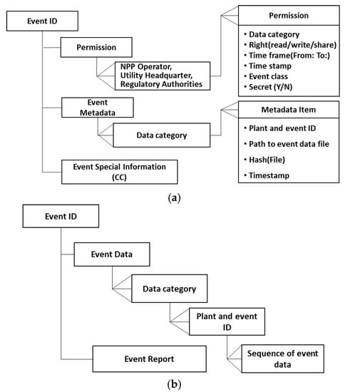 Figure 4 [] shows how the event metadata and event data are organized: the event data are stored off-chain locally (KHNP headquarters) Figure 4a presents the metadata of the events and consists of the following blocks: permission, event metadata, event information (optional). The permission block consists of the following: every permission corresponds to a node ID (NPPs, utility headquarters, and regulatory authorities); every permission specifies the period of time (from: to:) during which a node is authorized to read the event data belonging to a specific data category, upload (write) on the headquarters repository, or share event data within the framework of a specific fault, event class. If an event is designated as confidential, distribution or print can be limited. Event metadata are blocks that contain information about all the event data files uploaded to the headquarters repository (DREAMS server) by different nodes. Every item contains an ID (plant and event) of the plant that uploaded the data, path to the data file that is stored in the DREAMS server, hash of the data file and time stamp of the event when the data file was uploaded. Items in metadata are in accordance with the regulations related with the reporting of the accident or failure events in nuclear power plants. All details for the event is off-chain data and path to the data file is included in the event metadata.