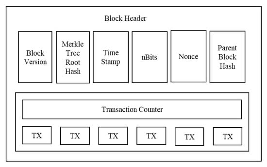In particular, the block header includes block versions, merkle tree root hash, time stamp, nBits, nonce, and the parent block hash. The body of the block consists of the transaction counter and the transaction. The maximum number of transactions a block can contain depends on the block size and the size of each transaction [].