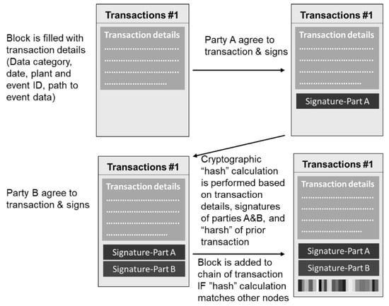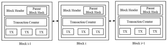 Figure 6 [] shows a generic chain of blocks. Blocks are chained through each block containing the hash of the previous block’s header to form a blockchain. If the previously posted block changes, the hash result will be different. As a result, every subsequent block also contains the hash of the previous block, so it will have different hash result values []. To include new records, the passage of a consensus mechanism is required to obtain agreement among all of the partners in the blockchain []. This makes it easy to detect and reject any changes in previously posted blocks.