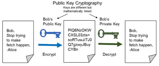 Asymmetric-key cryptography uses a pair of keys: mathematically related public and private keys. The public key may be published without reducing process security. However, the private key must be kept confidential if the data is password protected. No matter what the relationship is between the two keys, knowledge of the public key cannot be used to effectively determine the private key. Asymmetric-key cryptography allows anyone to encrypt messages using public keys. However, only the holder of the paired private key can decrypt. Security depends on the secrecy of the private key (See Figure 8). Asymmetric-key cryptography utilization in blockchain systems involves the following []: