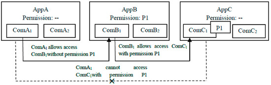 Figure 1 describes a privilege escalation attack based on multi-app collusion [25]. AppA and AppC do not apply for permission P1, while AppB applies for P1, and component ComC1 applies for P1; therefore, componentComA1 is not protected by P1, while components ComB1 and ComC1 are protected by P1. As can be seen in Figure 1: