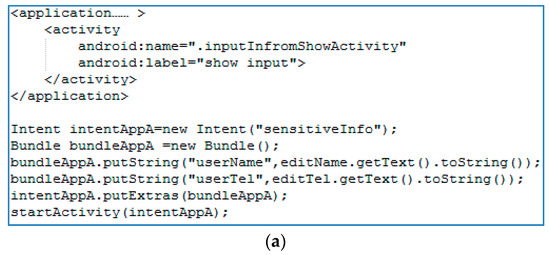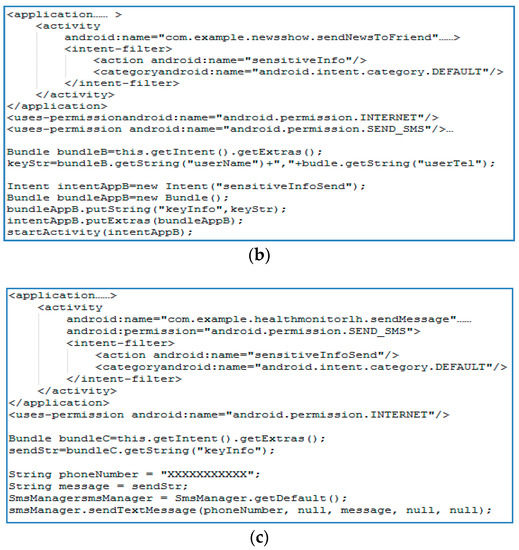 - comAppB has applied for the dangerous permission android.permission.SEND_SMS, and its component sendNewsToFriend has <intent-filter> as sensitiveInfo. The user’s private information (username and password) is obtained by bundleB and is sent to the component whose <intent-filter> is sensitiveInfoSend through intentAppB.