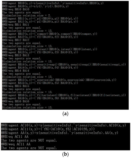 - Attack behavior modeling and determination. Based on the extraction of the attack behavior features set, process algebra is used to model app behavior and attack behavior, and weak equivalence is used to determine app behavior.