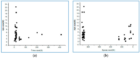 Therefore, according to the analysis of (1) and (2) on the above, the time cost and space cost of this method are prone to the phenomenon of two groups separated, as shown in Figure 5b. According to (3) on the above, due to special circumstances, those two groups are not necessarily completely separated, as shown in Figure 5a.