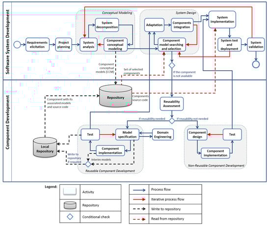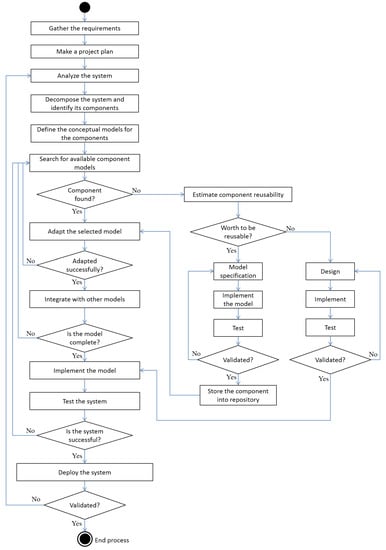 The process starts with requirements elicitation and ends after system validation within the system development process. Component development is done after conceptual modeling and reusable components are saved into the repository with all their associated models including the conceptual models. System design process employs component based approach whereas component search covers related model search as well. Repositories contain both models and implementations where various models and component source code are clearly labelled to identify their type. Component integration step in system design helps to specify a system model by integrating the adapted component models. System implementation stage includes the system integration with both reusable and non-reusable components. Each stage is explained in detail in the following section from a project-oriented system development perspective.