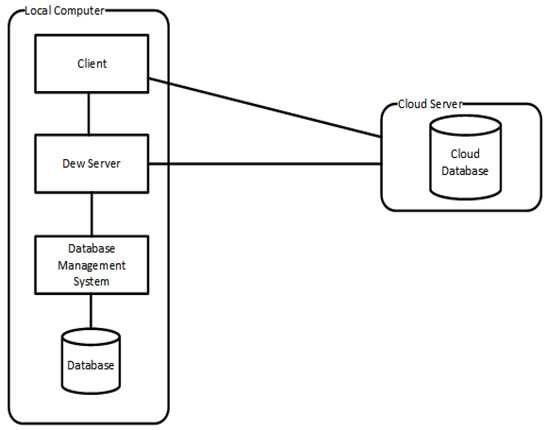 From Figure 2, a local computer consists of a client program, a dew server, a database management system, and a database. The dew server is a web server that is installed on a user’s local computer. The dew server and its components provide a similar service as a cloud server offer. It also updates data in the local database along with the cloud server database so that it has the same content.
