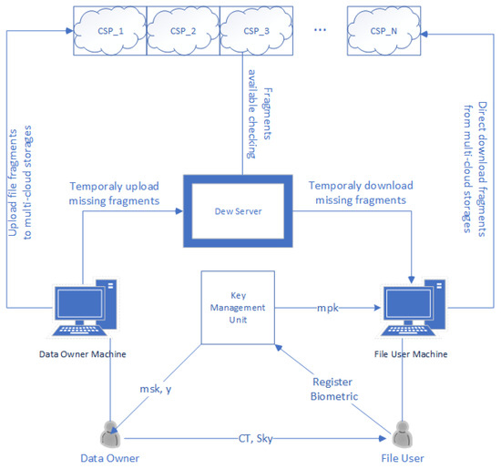The proposed architecture contains the following entities: the data owner, the dew server, the cloud storage providers, the key management unit, and the data user.