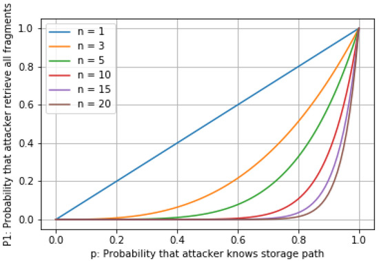 Probability that an attacker retrieves all fragments when the storage path is known.