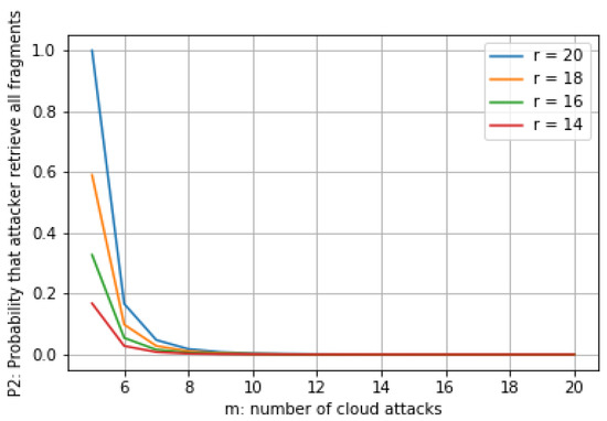 In the second scenario, Section 5.1.2, the probability that the attacker retrieves all fragments is expressed in Equation (5). We can simplify this equation by assuming that the number of fragments obtained by the attacker in each attack equals r fragments, and . The fragments that are stored in each cloud equal s fragments, and . is then simplified to