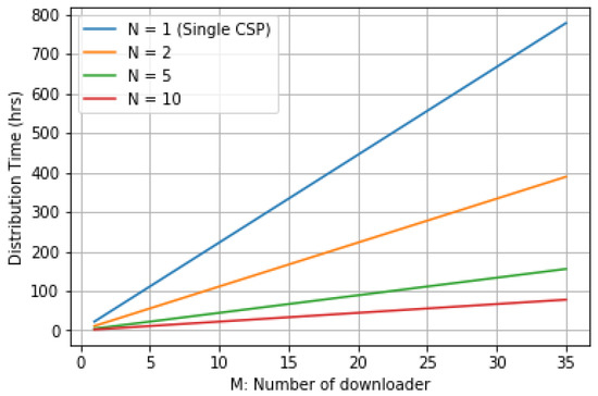 From [35], the minimum distribution time of the single CSP for sending its stored file to M user clients is