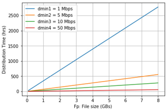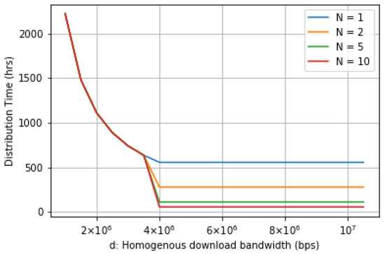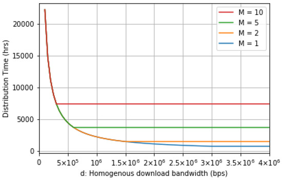 The single CSP provides its service to a various number of downloaders. We assume that each downloader has the equivalent download capability. When the value of d is lower than the aggregate upload of CSP, from Theorem 1, . On the contrary, when , downloaders have the same minimum distribution time for all values of d. In addition, if the number of downloaders is increased, the minimum distribution time also increases.