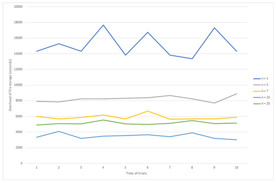 In simulation, the overhead of the traditional scheme includes the time of big data transmission from the client to cloud storage platforms. For the proposed scheme, the overhead includes the pre-processing cost of big data, which are file splitting, encryption, decryption, and the maximum transmission time of all the data parts. We test the proposed scheme in 5 different situations, which each situation handle different of number of fragments. In addition, we test each situation of the proposed scheme and the traditional Scheme 10 times individually. We record the whole process occur in our proposed scheme. It includes file splitting, fragments encryption, fragment uploading to cloud storage, fragment downloading from cloud storage, fragments decryption, and file merging. The simulation results are shown in Figure 12.