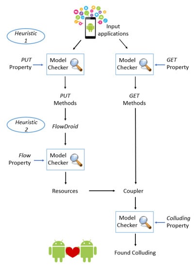 Our research work starts from just described considerations and in this paper we present a tool developed starting from an approach based on model checking, able to detect the collusion between Android applications [12]. We also propose two heuristic functions with the aim to reduce the number of the analyzed applications. The functions has been built using the -calculus temporal logic. During this work we have focused the attention on String, Int and Float resources shared, exploiting Android SharedPreferences.