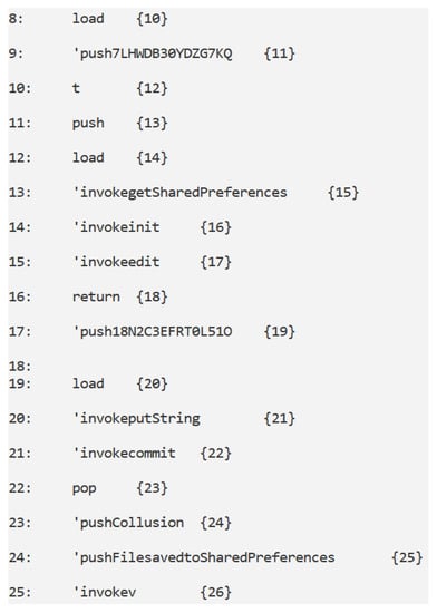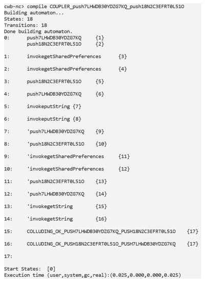 According to formula shown in Table 1, the model checker output true when the formula is checked because it exists a sequence of following instructions: invokegetSharedPreferences, invokegetString. In particular in Figure 2 the invokegetSharedPreferences instruction is the label between the 26 and the 28 nodes, while the invokegetString instruction is the label between the 34 and the 36 nodes.