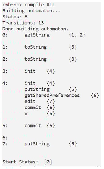 In this example, the automaton generated from the FlowDroid output is shown in Figure 4: whether the property shown in Table 2 is satisfied, one of this data is written into the SharedPreferences.