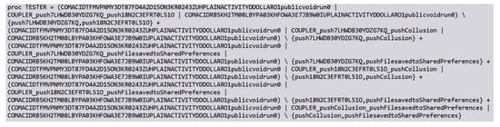 The idea behind the C automaton is to verify whether the PUT and the GET automata exhibits the same labels (in other words whether the PUT and the GET are invoking the sameSharedPreferences and they are respectively writing and reading the same item from the SharedPreferences). In this case the C automaton contains both the push7LHWDB30YDZG7KQ and the push18N2C3EFRT0L51O (retrieved from the GET model) and the ’push7LHWDB30YDZG7KQ and the ’push18N2C3EFRT0L51O obtained from the PUT one: in this specific case 18N2C3EFRT0L51O is the name of the SharedPreferences and 7LHWDB30YDZG7KQ is the key of the value that is wrote by the PUT class and read by the GET class. Once obtained the C process, we generate the Tester process as shown in Figure 6.