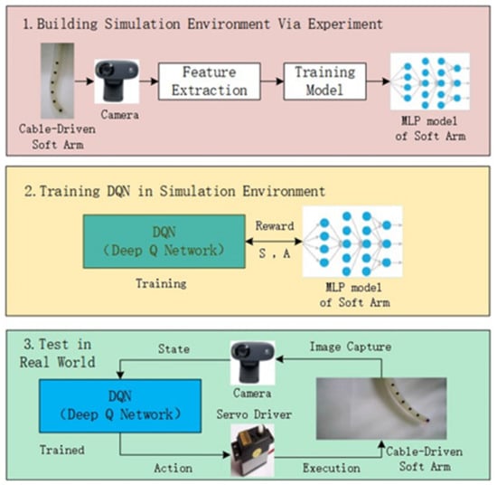 The third step is the real environment experiment. The image data are collected by the camera, and then input into the DQN after feature extraction. Finally, the DQN directly outputs the motion and converts it into a steering gear control parameter to directly control the steering gear, and realize the control of the soft robot arm. The overall process flow diagram of the system is shown in Figure 2.