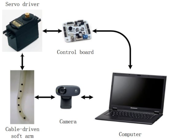 This section will analyze the effects of DQN in soft arm control through simulation and experiment. It is hoped that the advantage of the soft-arm control based on reinforcement learning is verified by experiments: (1) DQN selects the optimal action sequence during control; (2) the system is robust to external disturbances. The hardware structure of the system is shown in Figure 3. It consists of five parts: soft arm, camera, computer, steering gear and servo controller. The computer device CPU used is Intel CORE i5 and the GPU is NVIDIA GTX1050.