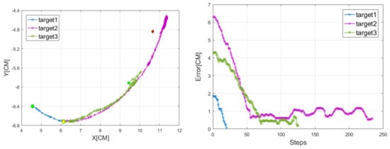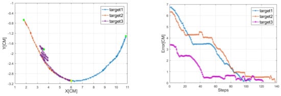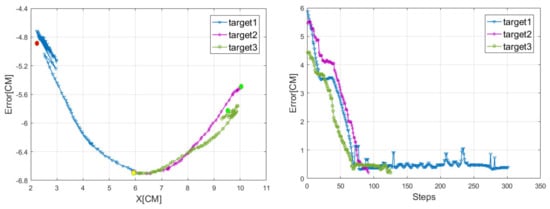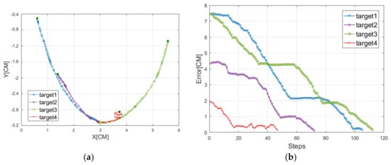 In the experiment, the starting point is fixedly set to drive the initial state of the steering gear, and then the target point is randomly selected in its motion space, and the condition for determining the suspension is the same as the simulation experiment. The experimental results are shown in Figure 6. Figure 6a is the end of the soft robot arm, and Figure 6b is the error of the end of the soft arm from the target. It can be concluded from the figure that the distance between the end of the soft robot arm and the desired target is continuously reduced as the action of the soft robot arm is performed, and finally the expected accuracy is achieved.