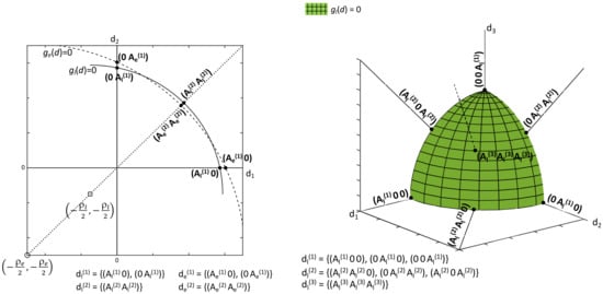 A detailed proof of this result based on solving the Karush–Kuhn–Tucker system of necessary optimality conditions, is reported in []. In the present simpler, but practically meaningful, case of negligible interaction among dose fractions, a geometrical interpretation of the extremal solutions can be given and it is qualitatively illustrated by Figure 1 for and 3. It can be noticed that the expressions of the boundaries of Equations (8) and (9) represent hyperspheres with centers on the five-dimensional bisect line at , , for any i. Then, the problem extremals lie on the positive portions of the boundaries of , , and precisely of the most restrictive constraint boundary (see Equation (12)) as shown in the left panel of Figure 1. Increasing n, the set of candidates is enriched with additional structures, as illustrated in the right panel of Figure 1 for the simplified situation of a single prevalent quadratic constraint (for instance ). The examples of Figure 1 can be considered representative of the more complex situation depicted by Theorem 1 (problem including dose interaction). Then, the problem geometry is similar to that of Figure 1 except for the fact that Equations (8)–(10) have elliptic contours, which makes the extremal set wider and the problem resolution more complicated. □