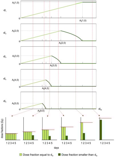 Fixing a relation between the number of dose fractions and the overall treatment time allows us to consider the number and the sizes of the dose fractions as the only decision variables. Obviously, the choice in Equation (22) is non-restrictive since different expressions of could be envisaged without substantially altering the problem solving procedure (e.g., two fractions/day or seven fractions/week). Numerical examples with different irradiation schemes investigating how clinically important factors, such as accelerated tumor repopulation, affect the optima are reported in []. Then, the problem studied here is that of minimizing the function (with S given by Equation (4)) with respect to both number and sizes of the fractional doses, taking into account the constraints on the normal tissue damages in Equation (5) (without incomplete repair) and the upper bound on the fractional dose sizes.