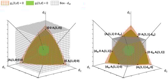 We observe that the radiosensitivity ratios are in general greater than 1 Gy either for tumors and for normal tissues. Typical values of reported in the literature range from about 2–3 to 50 Gy or more, whereas for the early and late normal tissues it is [,,]. Let us now define the 5-dimensional vector d with components . The constraints in Equation (5) can be written in the form