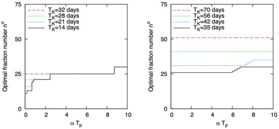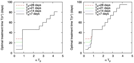 For fast proliferating tumors, the optimal fractionation scheme is uniform and made of fractions equal to . By contrast, as observed by some authors, the optimal treatment length is affected by and (actually by ) [,]. Figure 4 shows the optimal treatment time as a function of the product for , 14, 21, and 28 days. Moreover, (left) and 50 Gy (right), and Gy. Taking into account that most typically the average ranges in [1, 2.5] Gy days, the most recurrent is 46 days equal to the reference protocol duration. For very small , schedules shorter than the standard reference are preferable and in particular as close as possible to . When is large, protracting the treatment time can be advantageous.