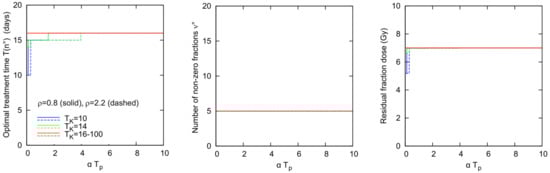 Figure 5 shows the optimal solution for the class as a function of for Gy. For this class, the optimal protocol is completely specified by the triple (or ), number of non-zero fractions at optimum , size of the “residual fraction". In fact, we remind that the optima of this class take the form or , where u depends on and is such that (see Table 8, Table 9 and Table 10) and the residual fraction is the only fraction different from zero and from . We add some comments to Figure 5. First, the optimal treatment time of 16 days is the minimal time allowing to satisfy the early tissue constraint with the equality sign. Second, and perhaps more interesting, for most of the considered parameter values, the plots of Figure 5 give a sharp indication of the optimum scheme of fractionation. Thus, when , our simulation indicates that the optimal solution is substantially insensitive to variations of the tumor parameters (for fixed values of the normal tissue parameters and ), which can be considered a very favorable feature of the problem under study, in view of the high heterogeneity of tumors and of the large uncertainty affecting the estimation of tumor parameters. Clearly, from a modeling point of view, the problem shifts towards that of accurately assessing the healthy tissue constraints and the related bounds on the tolerable radiation damage, as well as the value of .