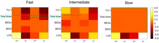 We observe that and the optimal total dose are moderately affected by the relative parameter variations, at least for slow and, in part, for intermediate tumors. On the contrary, for fast and intermediate tumors, significant variations for (up to −54%, see Figure 7, fast tumors panel, and columns) accompanied by noticeable variations of the optimal total dose (up to −35%) are obtained when the optimum tends to equal the kick-off time (21 and 28 days, respectively) unlike the conventional reference time of 35 days. Finally, reminding that the optima for all tumor types maximize at least one of the prescribed normal tissue BEDs, we verify that at least one between BED and BED is unaffected by the parameter variations, while the other shows only small (obviously negative) variations not larger than −15%.