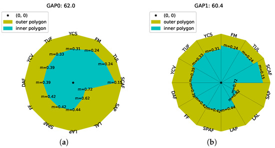 In Figure 1a, an example case for the computation of Geometric Aggregation of Popularity metrics (GAP0) is exemplified concerning the artist “The Rasmus” on 2 April 2019, resulting in GAP0 = 62.0. A second approach on Geometric Aggregation of Popularity metrics (GAP1) was to represent the metrics by the sides of the polygon and not by the vertexes. Thus, the inner polygon in this case was the aggregate of n isosceles triangles with side length equal to , as depicted in Figure 1b. The popularity was then calculated as in the first approach by applying Equation (2), resulting in GAP1 = 60.4. Furthermore, the simple average of the normalized metrics multiplied by 100 was 38.9.