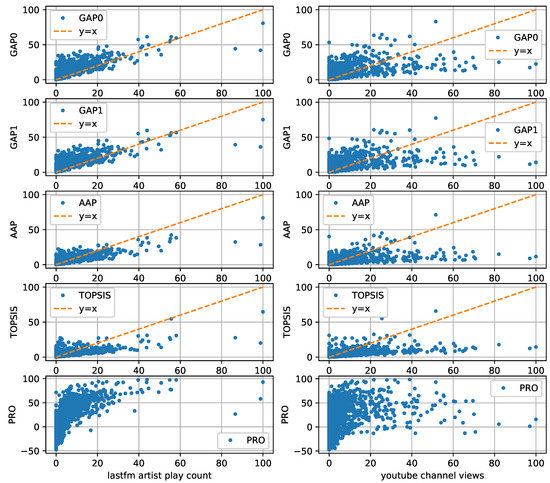 Scatter plots of Average Artist Popularity (AAP), GAP0, GAP1, TOPSIS, and Preference Ranking Organization (PRO) vs. Last.fm play counts (Left) and YouTube channel views (Right). Each dot represents an artist.