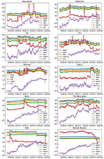 Timelines of aggregated artist popularity computed by GAP0, GAP1, AAP, TOPSIS, and PRO, for 10 artists with high discrepancy in their popularity as expressed by the monitored individual metrics.