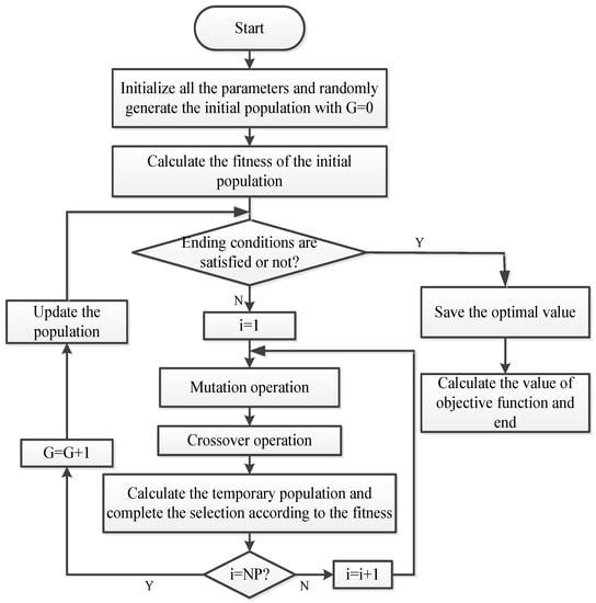 In this bi-level model, the optimization problem of the upper-level model is defined as and can be solved with the algorithm mentioned above, which is also applicable for the lower-level sub-problem. The flowchart of the DE-based solution approach is illustrated in Figure 1.