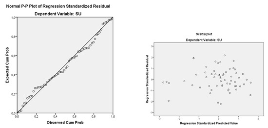 Standard P-P plot of the regression standardized residual and a residual scatter plot.